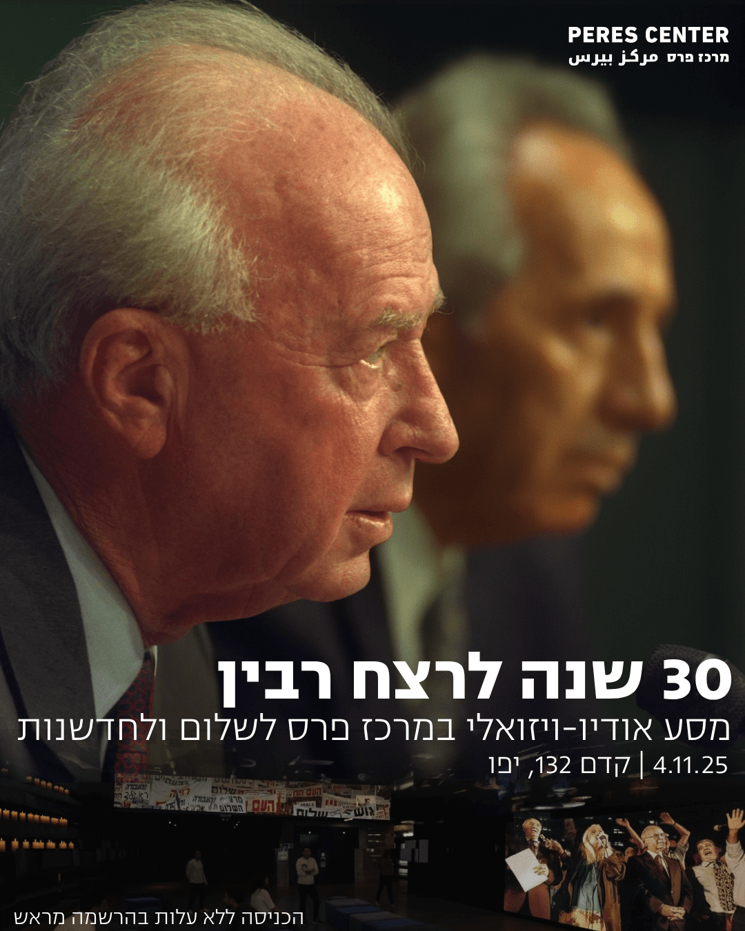 מרכז פרס לשלום ולחדשנות מזמין אתכם למסע אודיו-ויזואלי ייחודי ומרגש לזכרו של ראש הממשלה ושר הביטחון יצחק רבין ז"ל – חוויה אימרסיבית אליה מתכנסים קטעי וידאו מהעצרת, שידורי הטלוויזיה, שערי העיתונים מתוך הרגעים הדרמטיים שטלטלו את כולנו.