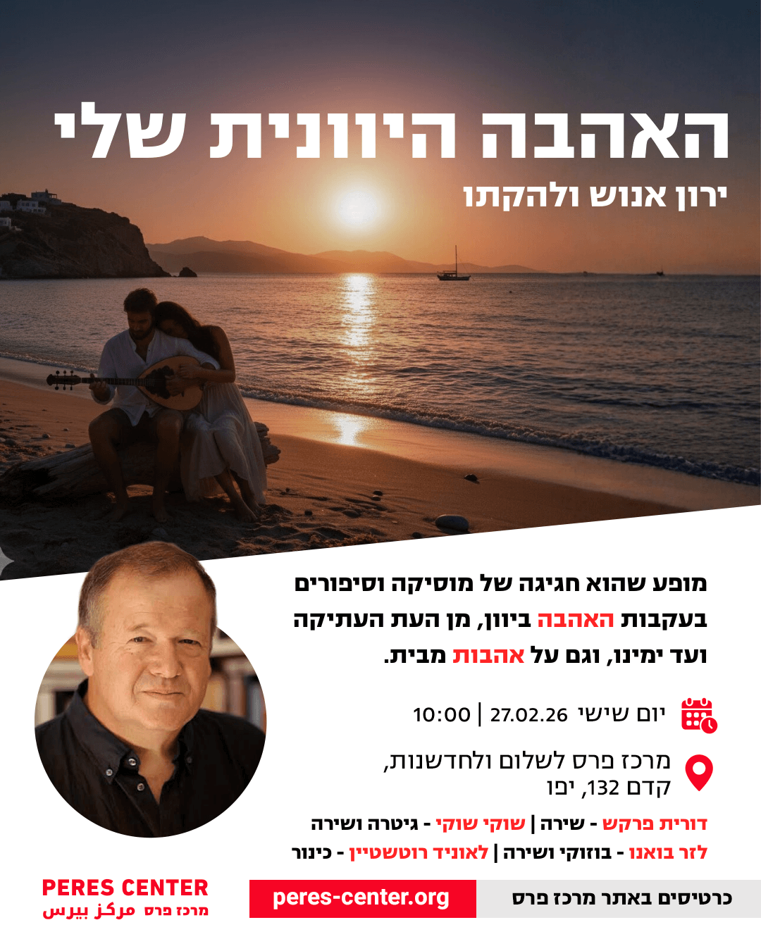 "כשהאהבה נוגעת בנו - אנו הופכים למשוררים", אמר אפלטוו. ירון אנוש מספר על האהבה ביוון, מן העת העתיקה ועד ימינו, וגם על אהבות מבית. זאת, בצד ביצוע של הטובים והידועים שבשירי האהבה של יוון שנחתו גם בחופי ישראל.